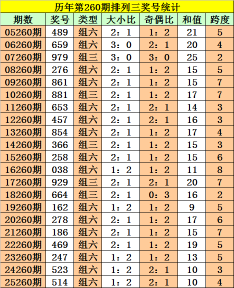 罗列三第2025260期奖号:514,和值10,跨度4,大小比1:2,奇偶比2:1。