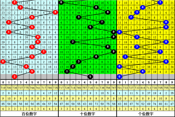 积年第261期罗列三奖号中,开出次数最多三码为:0、3、5,本期注释号码:0。