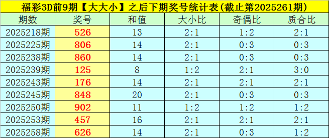 5、不才期奖号中,号码大小比为:2:1、2:1、2:1、1:2、2:1、2:1、1:2、2:1、2:1,号码大小比总比例为16:11,本期凝视小 号热出,看好大小比为1:2。